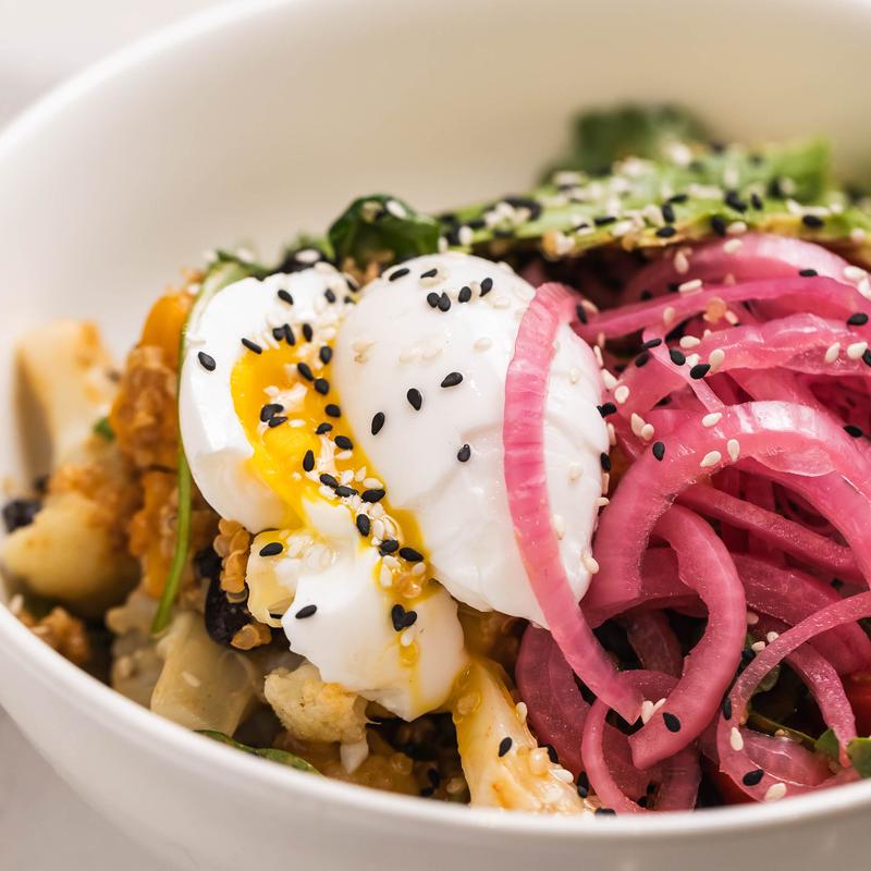 Quinoa, butternut squash, cauliflower, avocado, black beans, tomato, arugula, soft-boiled egg, sriracha, tahini dressing.