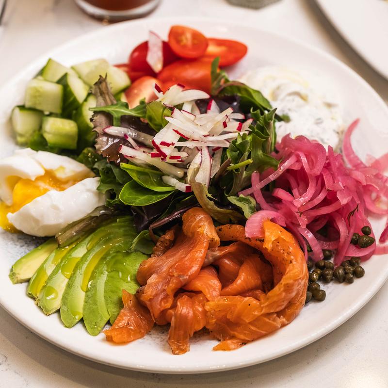Homemade smoked salmon, labneh, capers, pickled onions, avocado, cherry tomatoes, cucumbers, mixed greens salad & 6-minute egg. served with multigrain toast.