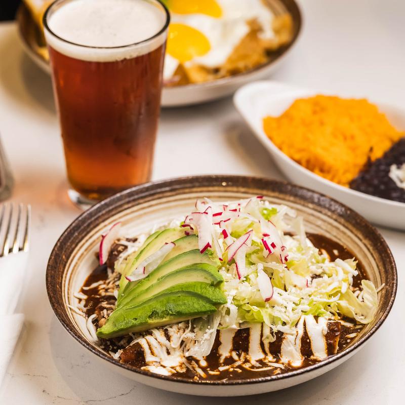 Corn tortillas rolled with shredded chicken, smothered in our traditional mole poblano. Topped with lettuce, red onion, cotija cheese & avocado. Served with rice & beans.