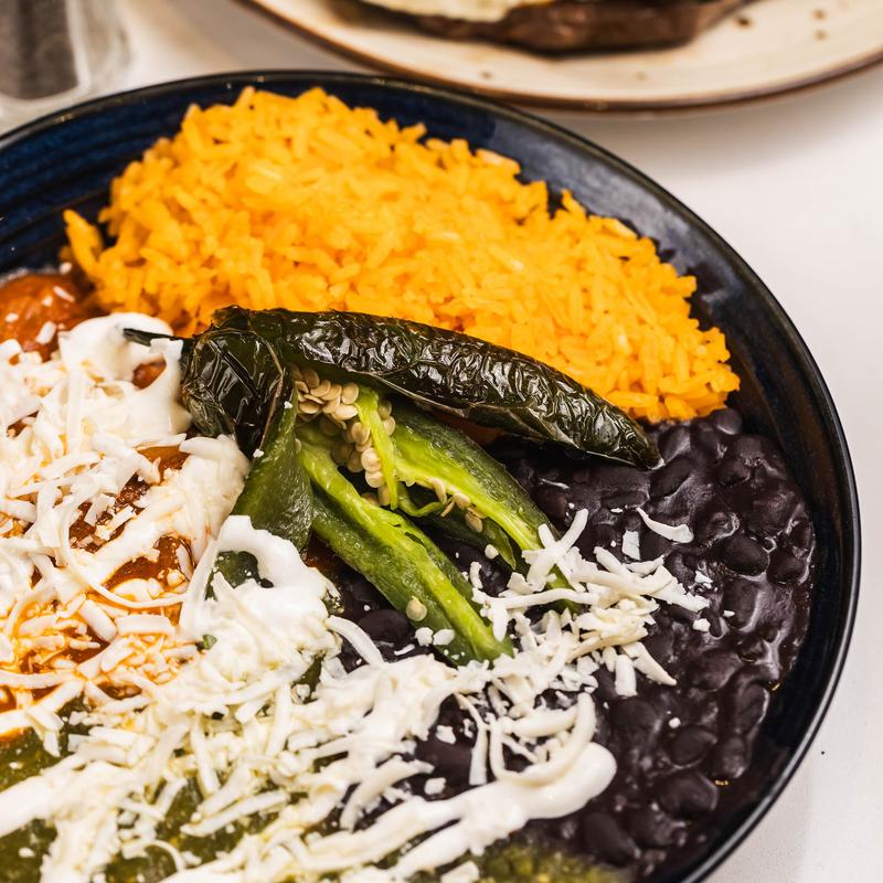 New York steak served with rice and beans, guacamole, roasted jalapeño, queso fresco and 3 soft corn tortillas